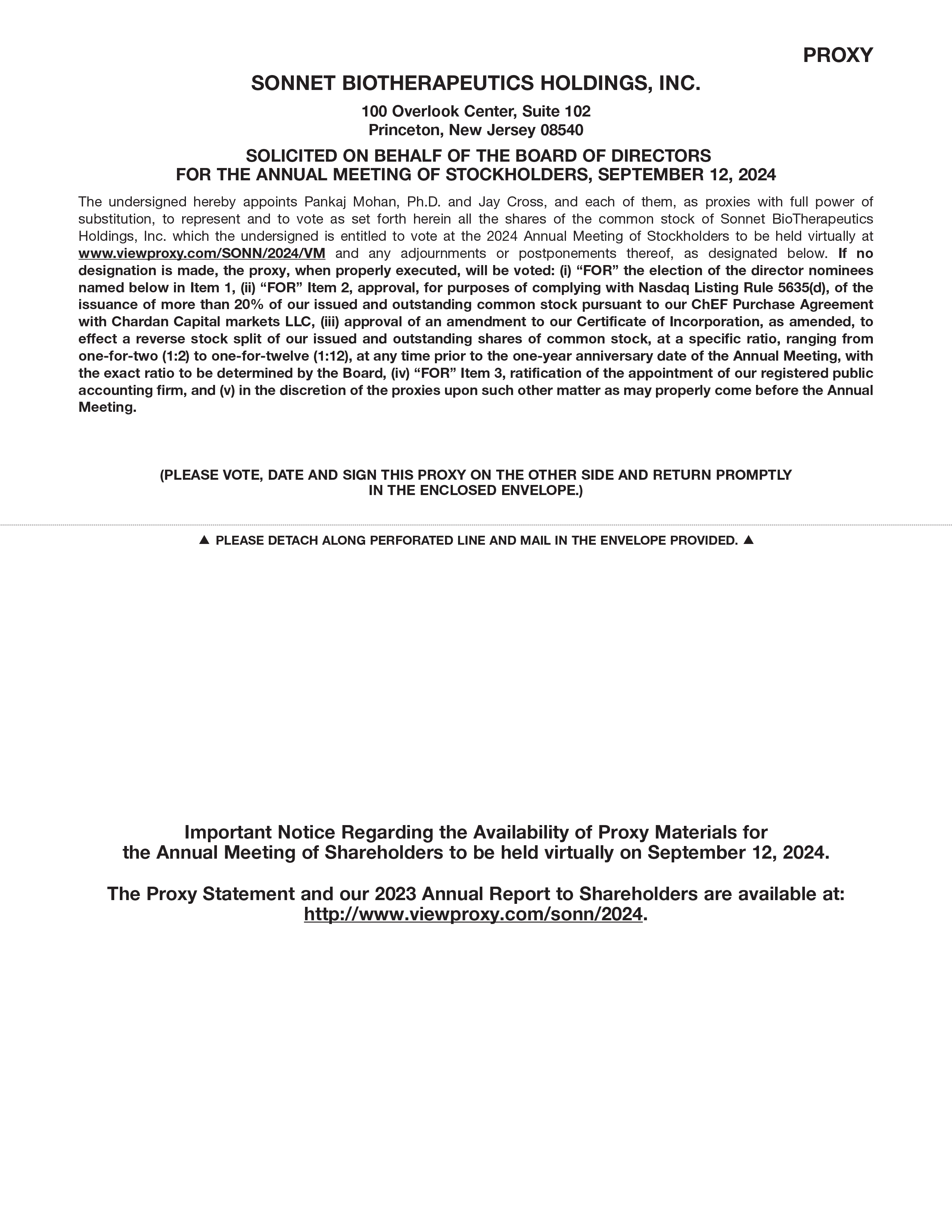 In this Proxy Statement, the terms the “Company,” “we,” “us,” and “our” refer to Sonnet BioTherapeutics Holdings, Inc. The mailing address of our principal executive offices is Sonnet BioTherapeutics Holdings, Inc., 100 Overlook Center, Suite 102, Princeton, New Jersey 08540.