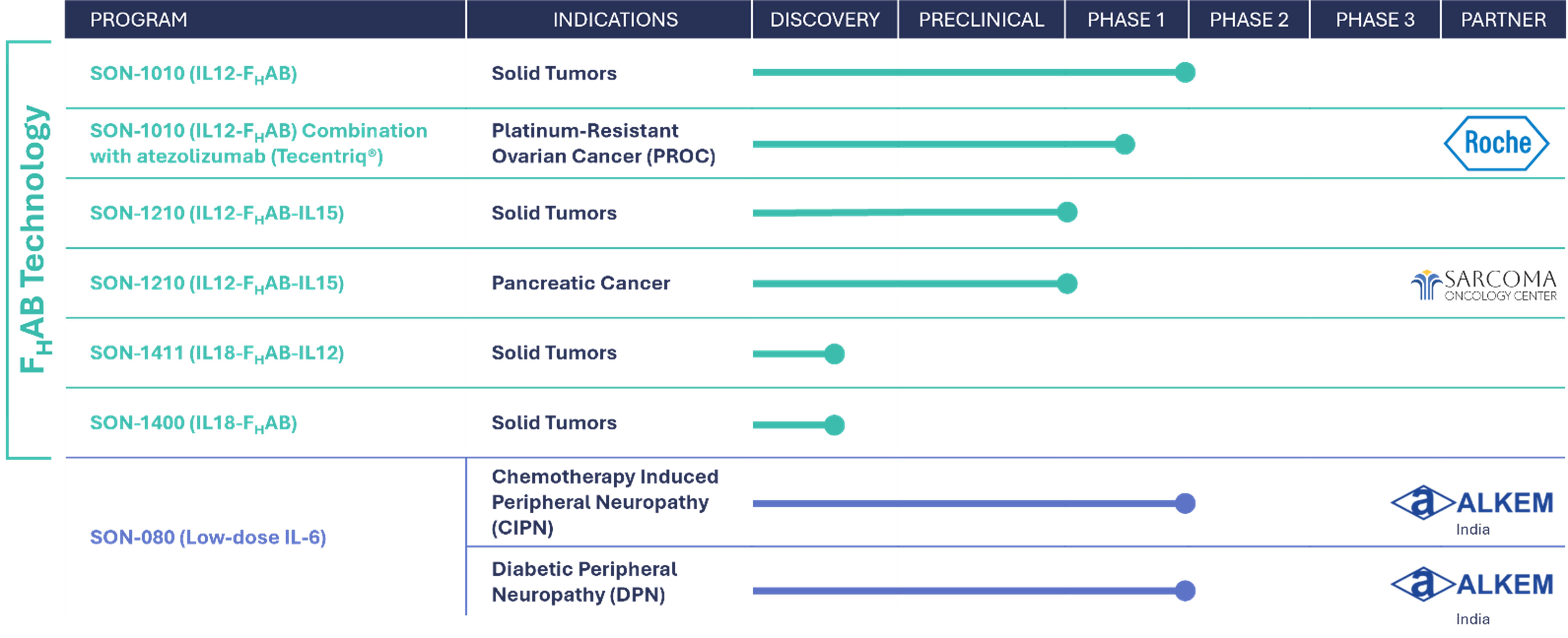 | ● | SON-1210 (IL12-FHAB-IL15), our lead bifunctional compound, combines the FHAB construct with single-chain IL-12 and fully human Interleukin 15 (IL-15). This compound is being developed for solid tumor indications, including colorectal cancer. In February 2023, we announced the successful completion of two IND-enabling toxicology studies with SON-1210 in NHPs. In August 2024, we announced a clinical collaboration agreement to commence an investigator-initiated and funded Phase 1/2a study of SON-1210 in combination with chemotherapy for the treatment of pancreatic cancer. We are prepared to initiate commercial development of SON-1210, pending the outcome of any partnering activity. |