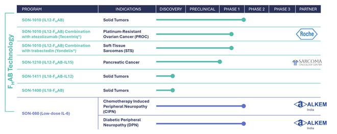 | ● | SON-1210 (IL12-FHAB-IL15), our lead bifunctional compound, combines the FHAB construct with single-chain IL-12 and fully human Interleukin 15 (IL-15). This compound is being developed for solid tumor indications, including pancreatic and colorectal cancer. In February 2023, we announced the successful completion of two IND-enabling toxicology studies with SON-1210 in NHPs. In August 2024, we announced a clinical collaboration agreement to commence an investigator-initiated and funded Phase 1/2a study of SON-1210 in combination with chemotherapy for the treatment of pancreatic ductal adenocarcinoma (PDAC). We are prepared to initiate commercial development of SON-1210, pending the outcome of any partnering activity. |
