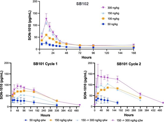 This first-in-human study is primarily designed to evaluate the safety, tolerability, PK, and PD of multiple ascending doses of SON-1010 in cancer patients and is being conducted at several sites across the United States. We recently completed dose escalation in the Phase 1 SB101 clinical trial of SON-1010 (IL12-FHAB) in adult patients with advanced solid tumors and are expanding that study using SON-1010 monotherapy with trabectedin in certain types of soft-tissue sarcoma (STS). We reported that results of SON-1010 at the highest dose have been formally evaluated by the Safety Review Committee. We announced topline safety data and the completion of dose escalation in December 2024, at a dose of 1200 ng/kg. Clinical benefit, defined as stable disease for at least 4 months, was seen in 48% of the patients overall and in 83% at the highest dose, including one patientwith sarcoma who had a partial response to SON-1010.